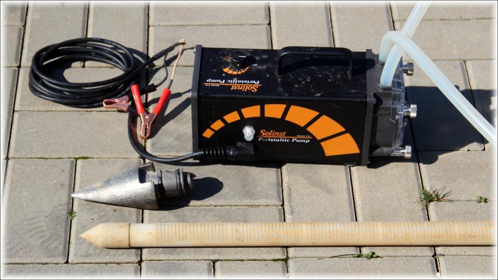 ... vrtačky, a vytvořenými otvory následně vrtat do zemin dle výše popsaného způsobu. Pokud je z úzkoprofilového vrtu zapotřebí odebrat vzorek vody, popřípadě provést sludge test (orientační čerpací test), použijeme při úzkoprofilovém vrtání metodu ztraceného hrotu. To umožní pomocí speciálních nástavců dočasně propažit stvolu vrtu a vystrojit ho pažnicí (používáme příčně perforovanou HDPE DN32 mm se šíří štěrbiny 0.5 mm), popřípadě obsypat filtrem a osadit uzamykatelnou chráničkou. Takto připravený vrt může v prostředí s mělce zaklesnutou hladinou vody sloužit jako plnohodnotný monitorovací objekt. Vzorek vody z hloubek do 7 m lze odebírat pomocí peristaltické pumpy s PE trubičkou o průměru 10 mm. Pokud zvodněné prostředí vykazuje nižší koeficient filtrace, lze s pomocí dataloggeru vsazeného do pažnice provést a vyhodnotit orientační čerpací nebo nálevový test.